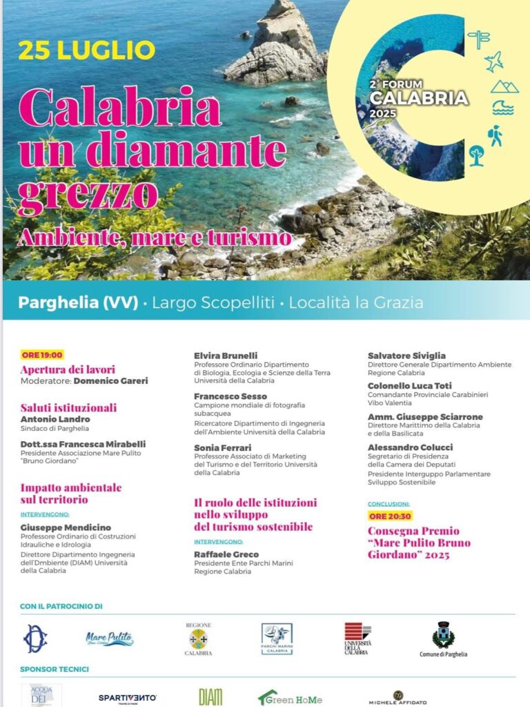 Si terrà il prossimo 25 luglio, nella splendida cornice di Largo Scopelliti – località La Grazia a Parghelia, il 2° Forum Calabria 2025 dal titolo emblematico “Calabria, un diamante grezzo – Ambiente, mare e turismo”. Un incontro di alto profilo che punta a stimolare un dibattito concreto sul valore e le potenzialità del territorio calabrese, tra sostenibilità ambientale, sviluppo turistico e valorizzazione del patrimonio naturale.