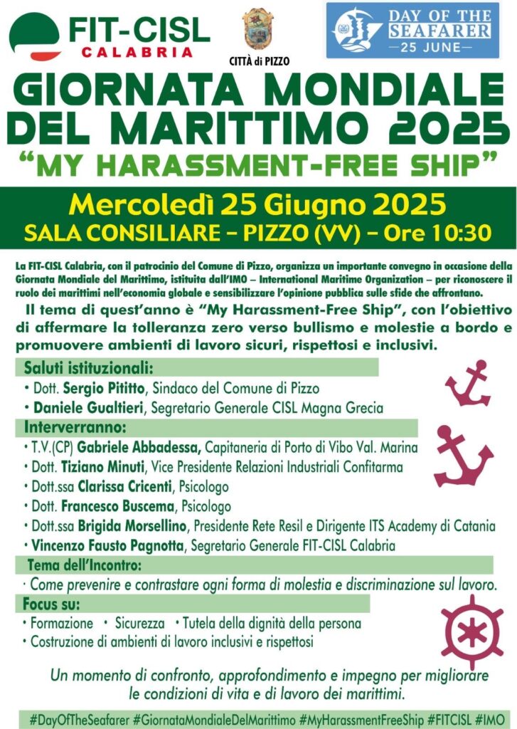 «In occasione della Giornata Mondiale del Marittimo 2025, la Fit-Cisl Calabria, con il patrocinio del Comune di Pizzo, promuove un importante convegno sul tema lanciato dall’Imo (International Maritime Organization): “My Harassment-Free Ship”. L’obiettivo è affermare la necessità di creare ambienti di lavoro a bordo delle navi che siano totalmente liberi da molestie, bullismo e discriminazioni».