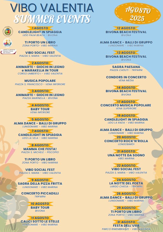 Vibo Valentia si prepara a vivere «un agosto straordinario, ricco di appuntamenti pensati per coinvolgere cittadini, turisti e appassionati di ogni età». Il cartellone estivo, promosso dall’amministrazione comunale di Vibo Valentia, propone un calendario variegato che spazia tra concerti, festival gastronomici, spettacoli teatrali e iniziative culturali.
