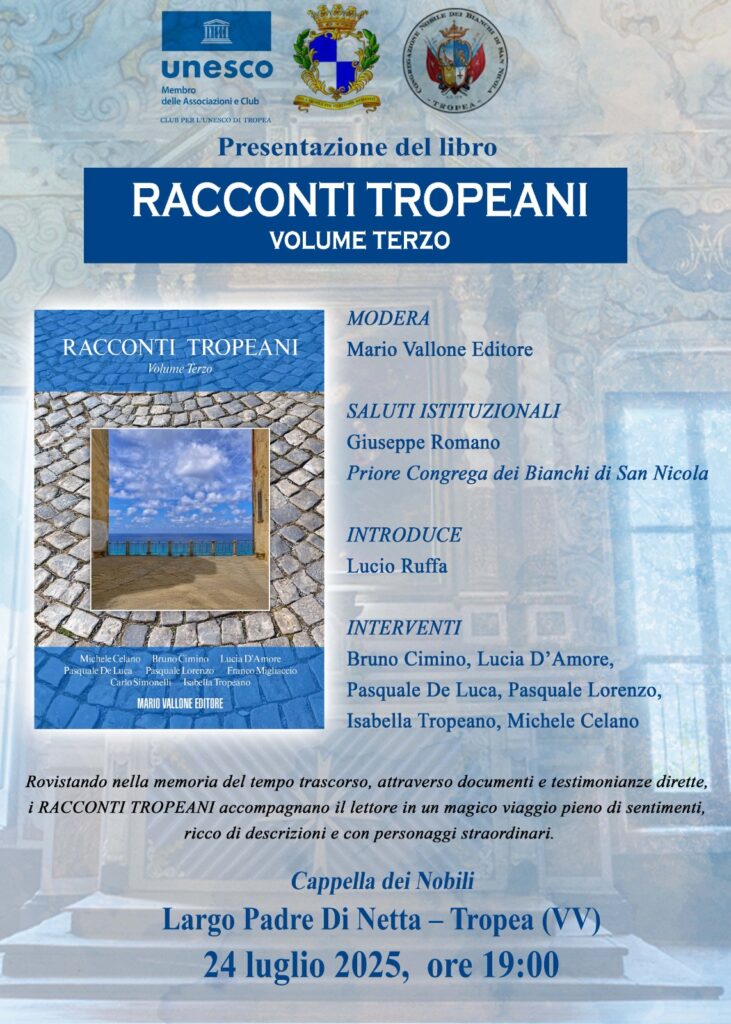 Manca davvero poco alla presentazione dell’opera “Racconti Tropeani – Volume Terzo”, in programma alle ore 19:00 del 24 luglio, presso l’antica Cappella dei Nobili di Tropea. Edito da Mario Vallone Editore, il volume conclude la trilogia “Racconti Tropeani” e ha registrato la partecipazione dei seguenti autori: Michele Celano, Bruno Cimino, Franco Migliaccio, Isabella Tropeano, Carlo Simonelli, Pasquale De Luca e Pasquale Lorenzo.