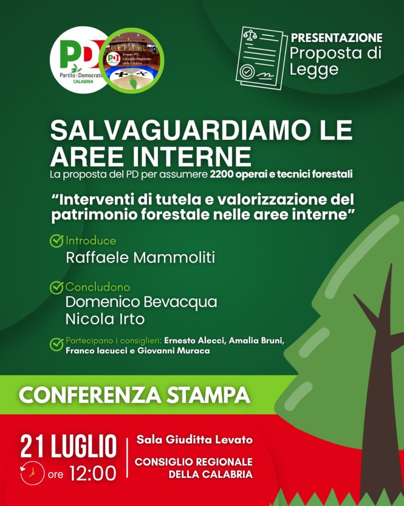 Il gruppo del Partito democratico nel consiglio regionale della Calabria presenterà lunedì 21 luglio alle 12:00, presso la Sala “Giuditta Levato” di Palazzo Campanella, una nuova proposta di legge dedicata alla tutela e valorizzazione del patrimonio forestale nelle aree interne. L’iniziativa, si legge in una nota, «mira a sostenere attivamente il territorio, contrastare lo spopolamento e promuovere nuova occupazione stabile, prevedendo l’assunzione di 2.200 operai e tecnici forestali».