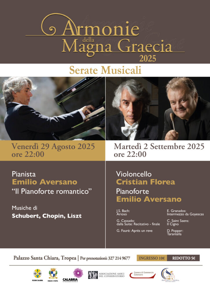 “Armonie della Magna Graecia“, ideata dall’Associazione Amici del Conservatorio, è realizzata con il sostegno del Comune di Tropea, della Camera di commercio di Catanzaro-Crotone-Vibo Valentia (Bando Turismo 2025), ed è candidata agli avvisi della Regione Calabria a valere sul Poc 2014/2020.