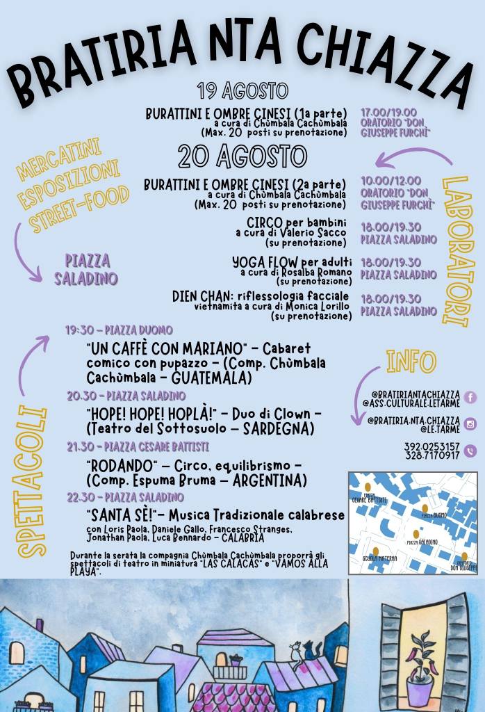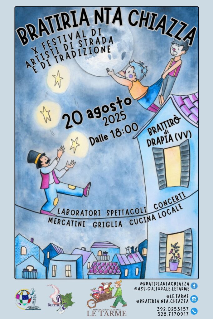 L’associazione culturale Le Tarme, nata dall’impegno di Annamaria Pugliese e sostenuta da un attivo gruppo di volontari, si prepara a vivere la decima edizione del Festival “Bratiria ‘nta chiazza”, previsto il 19 e 20 agosto in più punti della comunità di Brattirò di Drapia.