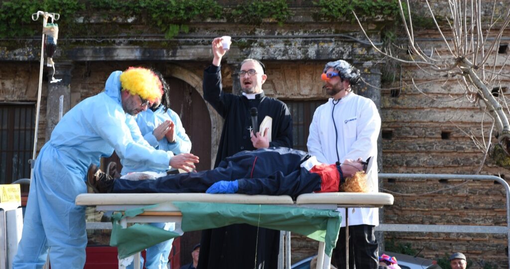 Accompagnato dalla moglie “corajisima” (raffigurante la quaresima) giunge in barella presso la piazza del paese ove su un palco allestito per l’occasione si procede ad un intervento chirurgico effettuato da un medico strampalato coadiuvato da due infermieri. Il trio, alternando sorsi di vino e morsi a crocchette di carne alla falsa operazione medica, procede ad estrarre le interiora del povero Carnevale (rappresentante con delle salsicce) e a prelevarne il sangue (magicamente tramutatosi in vino). All’esito dell’intervento, il medico pronuncia la storica frase: “l’operazione è riuscita, il paziente è morto”.