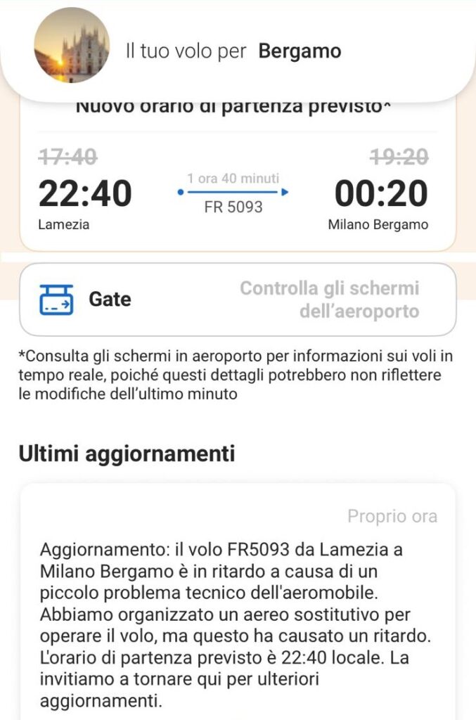 Disagi per i passeggeri del volo Ryanair FR5093, diretto da Lamezia Terme a Milano Bergamo, che oggi giovedì 25 luglio ha subìto un significativo ritardo a causa di un guasto tecnico all’aeromobile. L’orario di partenza inizialmente previsto per le 17:40 è stato posticipato di ben cinque ore: la nuova stima comunicata dalla compagnia indica le 22:40.