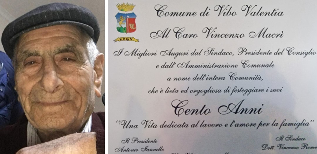 È scomparso alla vigilia dei suoi 100 anni, per i quali erano pronti i doverosi festeggiamenti, ma l’amministrazione comunale di Vibo Valentia ne ha comunque voluto omaggiare la figura e la memoria. Vincenzo Macrì, cittadino di Triparni, conosciuto e sempre ben voluto dalla sua comunità, avrebbe spento la triplice candelina il 31 marzo, ma è venuto a mancare 24 ore prima.