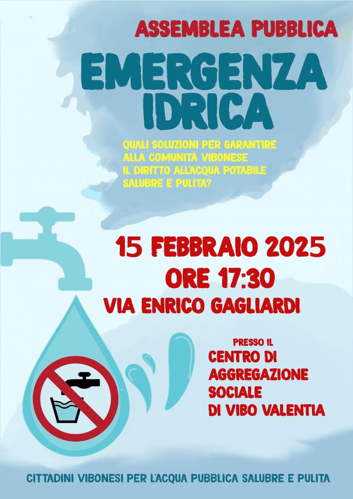 Convocata per sabato 15 febbraio, alle ore 17,30, presso il Centro di aggregazione sociale di via Gagliardi, a Vibo Valentia, un’assemblea pubblica per discutere dell’emergenza idrica a Vibo Valentia, ma soprattutto su quali iniziative possano eventualmente essere intraprese per garantire ai cittadini un servizio idrico continuo e sicuro.