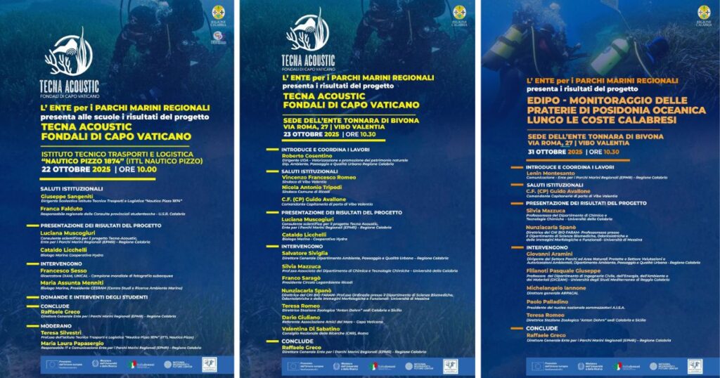 - 31 ottobre 2025 (ore 10.30) – Sede dell’Ente Tonnara di Bivona, via Roma 27, Vibo Valentia: presentazione dei risultati del progetto EDIPO, focalizzato sul monitoraggio delle praterie di Posidonia oceanica lungo le coste calabresi.