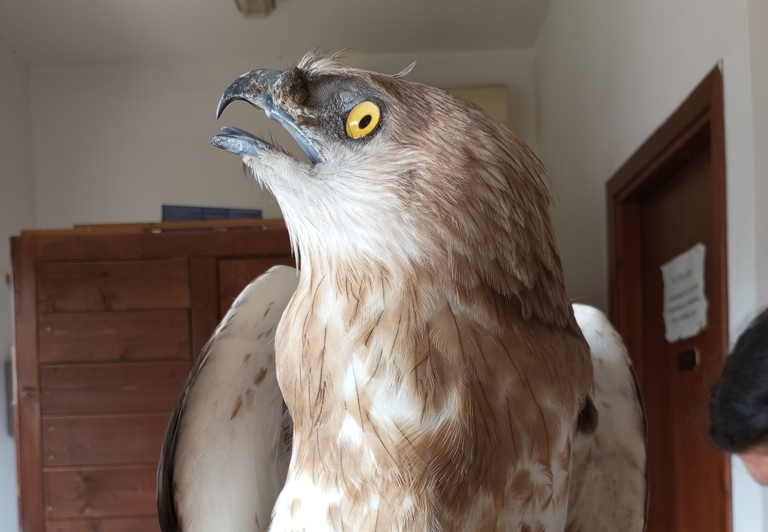 Uno splendido esemplare di biancone, noto agli ornitologi come “aquila dei serpenti”, si è salvato grazie alla sensibilità e al pronto intervento di due poliziotti della Polfer di Lamezia: il Vice Sovrintendente Giovanni Buonocore e l’Assistente Francesco Cuda. Sono stati loro infatti, mentre transitavano con l’auto di servizio lungo la Statale 18 in territorio di Curinga, a notare sul bordo della strada il grande volatile, in evidente stato di difficoltà, che rischiava di essere travolto dalle auto in transito. Da qui l’immediata decisione di fermarsi per evitare non solo la morte del povero animale, ma anche un incidente, vista la pericolosità del tratto di strada. Scattato l’allarme, dalla Questura di Catanzaro è partita la richiesta di soccorso per il recupero del grande rapace, prontamente accolta dal naturalista del Wwf di Vibo Valentia, Pino Paolillo che, in contatto con gli agenti rimasti sul posto, ha recuperato il Biancone (un giovane esemplare, secondo il naturalista), e lo ha trasportato subito fino al Cras di Catanzaro, affidandolo alle cure della direttrice Debora Giordano che ha constatato il grave deperimento del giovane Biancone.