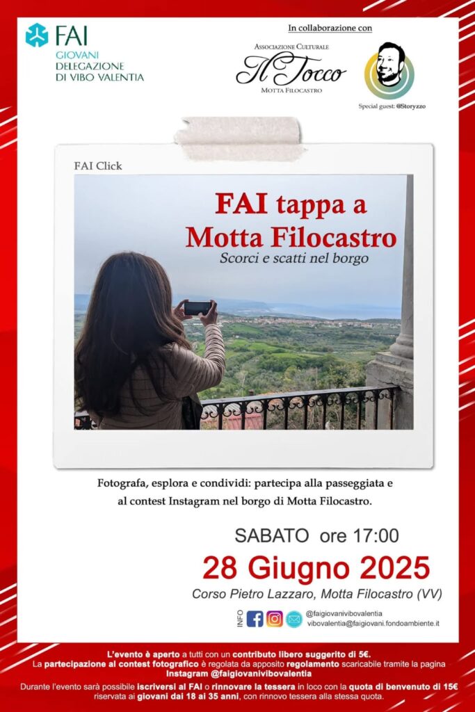 Durante la passeggiata, si svolgerà un coinvolgente contest fotografico su Instagram, dal titolo #FAItappaaMotta. Tutti gli utenti partecipanti potranno caricare i loro scatti più rappresentativi, con l’obiettivo di catturare l’identità visiva del borgo attraverso la loro personale interpretazione. Lo scatto vincitore non solo racconterà Motta Filocastro, ma permetterà al suo autore di vincere una visita guidata per due persone al Bene FAI “I Giganti della Sila”, con biglietti open validi fino al 31 ottobre 2025. A dare ulteriore prestigio al contest, la presenza dello storyteller e content creator @storyzzo, ospite speciale dell’evento e membro della giuria. La realizzazione dell’evento ha visto lavorare in totale sinergia il gruppo del FAI Giovani con l’associazione culturale “Il Tocco”.