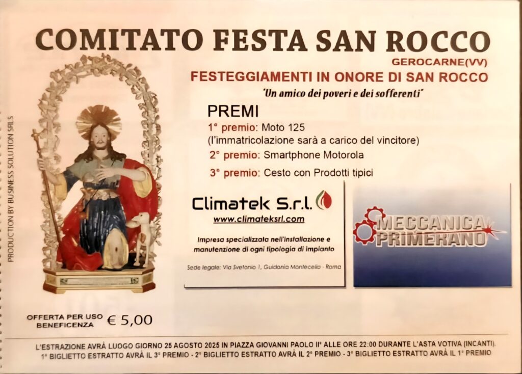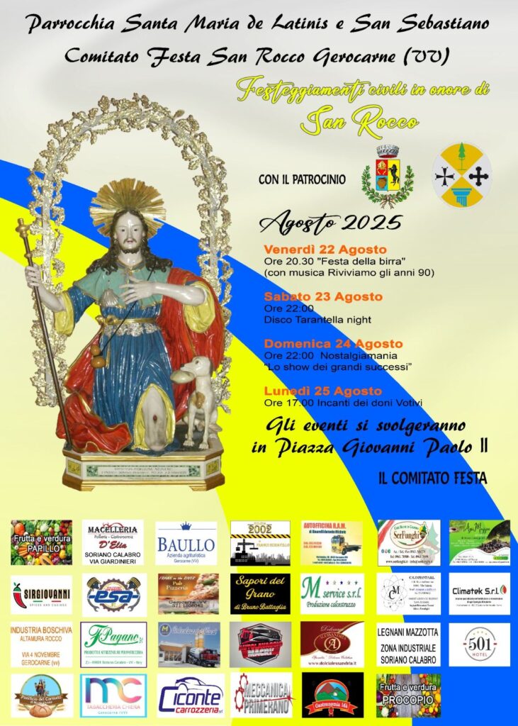 Il Comitato Festa San Rocco di Gerocarne, per la Parrocchia Santa Maria de Latinis e San Sebastiano, ha annunciato il programma dei festeggiamenti civili in onore del santo, “un amico dei poveri e dei sofferenti“, con il patrocinio del Comune e della Regione Calabria. Tre serate che si svolgeranno in Piazza Giovanni Paolo II unendo musica, enogastronomia e momenti dedicati alla tradizione.