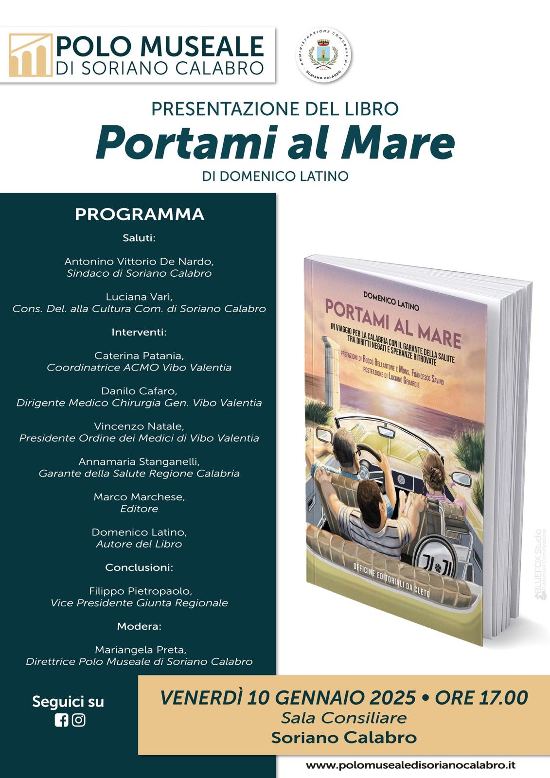Domani, venerdì 10 dicembre, alle ore 17, presso la sala consiliare del Comune di Soriano Calabro, verrà presentato il libro “Portami al mare. In viaggio per la Calabria con il Garante della Salute tra diritti negati e speranze ritrovate” (Officine Editoriali da Cleto 2024). Dieci storie vere (rese pubbliche grazie al lavoro degli organi di informazione, prese in carico e risolte dall’ufficio del Garante regionale della Salute, Anna Maria Stanganelli) al centro del libro curato dal portavoce dell’ufficio, il giornalista Domenico Latino.