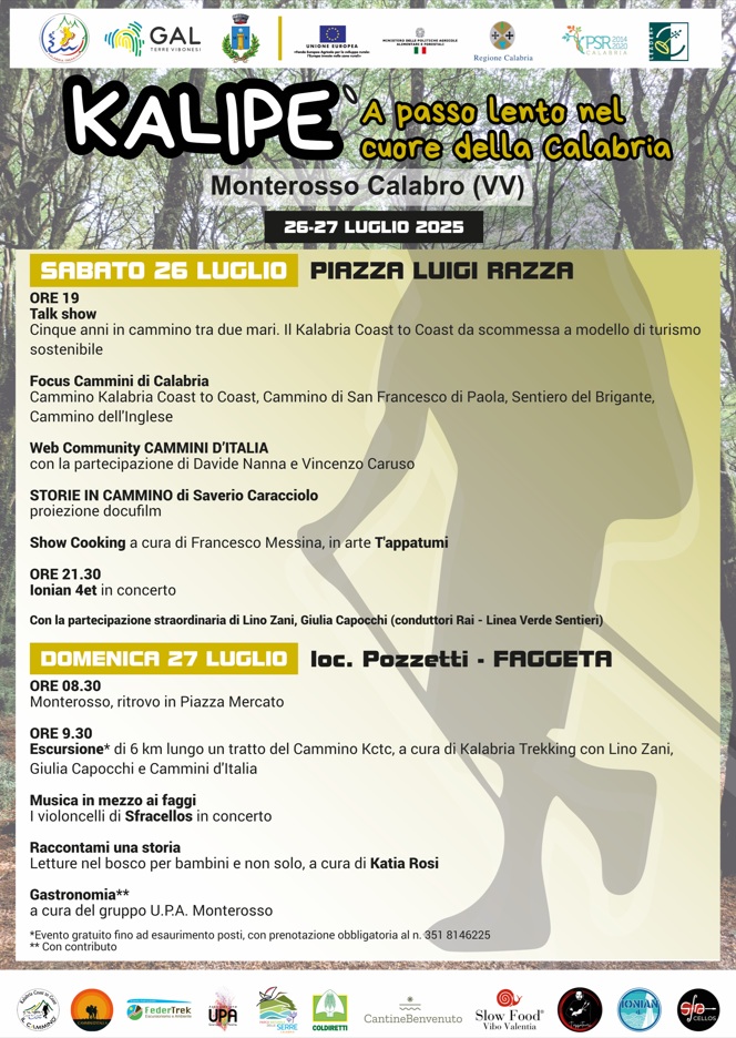 Kalipè 2025 è realizzato con il contributo di Gal Terre Vibonesi e il patrocinio del Comune di Monterosso Calabro, con il partenariato di Cammini d’Italia, Federtrek, Parco delle Serre, Slow Food Vibo Valentia, Coldiretti, Cantine Benvenuto, Upa Monterosso.