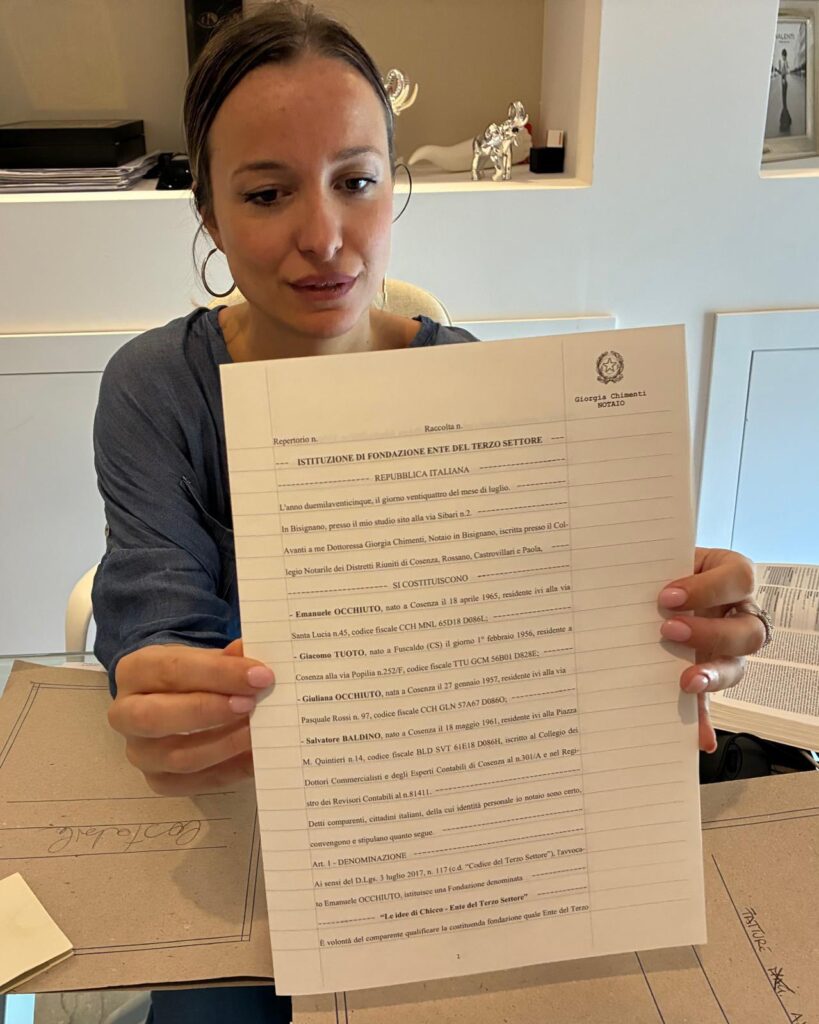 Tutto ciò che verrà costruito – chiude Occhiuto – «sarà destinato esclusivamente a fini civici, culturali e sociali, come previsto dallo statuto. Chi desidera offrire un’idea, una proposta o una collaborazione può scriverci a: [email protected]. E ora, con passo leggero, cominciamo.  Chicco ci è accanto. Con la sua voce calma, con i suoi pensieri curiosi, con il suo modo unico di volere bene. Le sue idee non muoiono. Camminano. Ci accompagnano. E ci indicano la direzione giusta».