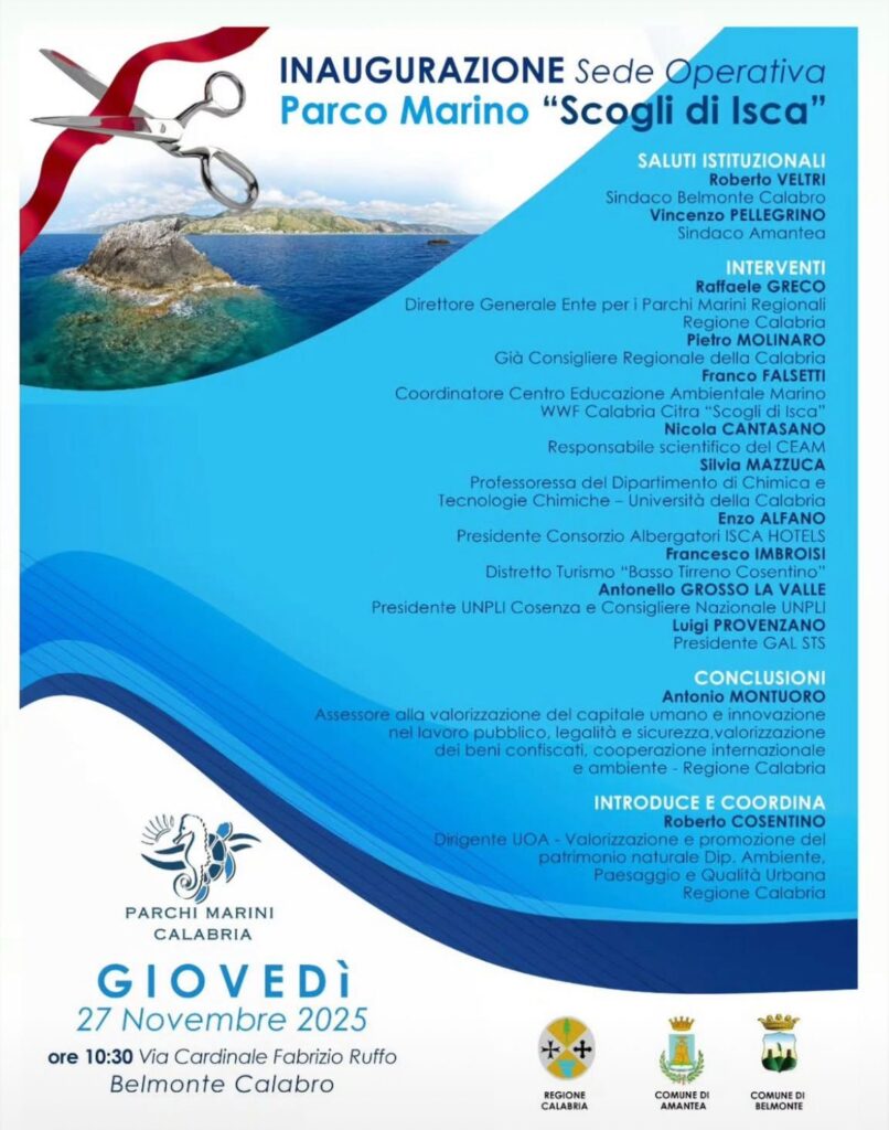 Il prossimo giovedì 27 novembre 2025, alle ore 10:30, si terrà a Belmonte Calabro l’atteso evento di inaugurazione della sede operativa del Parco Marino “Scogli di Isca”. Un’iniziativa di grande valore per la tutela ambientale e lo sviluppo turistico della costa tirrenica calabrese.