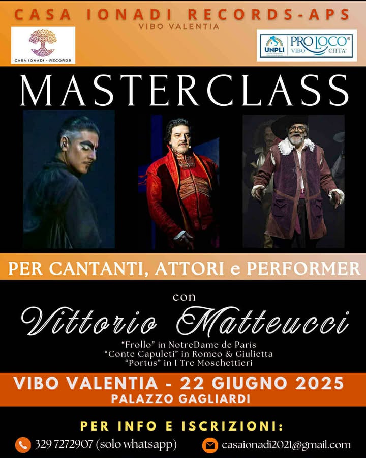 «Un evento formativo senza precedenti si terrà il 22 giugno a Vibo Valentia, presso Palazzo Gagliardi: la masterclass “La voce non mente” dedicata a cantanti, attori e performer. A condurla sarà il maestro Vittorio Matteucci, noto al grande pubblico per aver interpretato ruoli iconici come Frollo in “Notre Dame de Paris“, il musical dei record, e Conte Capuleti in “Romeo e Giulietta – Ama e Cambia il mondo“, entrambe colossali produzioni di David Zard. Attualmente, Matteucci è in tour in Italia con Portus ne “I tre moschettieri“, con la regia di Giuliano Peparini».