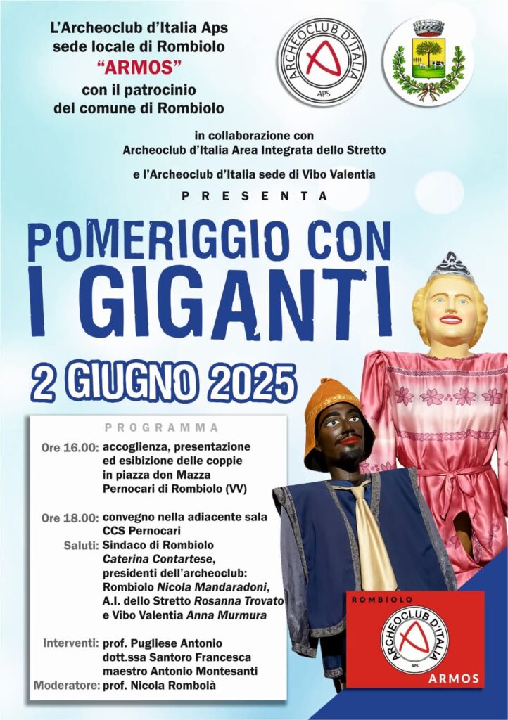 Il raduno partirà ufficialmente alle ore 16:00 da Piazza don Mazza, con l’accoglienza e con la presentazione di tutte le coppie di giganti che hanno aderito all’appuntamento. Subito dopo, ogni coppia di giganti inizierà ad esibirsi a turno nella piazza. Come se non bastasse, a partire dalle ore 18:00, inizierà un convegno nella sala dell’auditorium Ccs di Pernocari. Il convegno sarà introdotto dai saluti del sindaco di Rombiolo Caterina Contartese e anche dagli interventi di Nicola Mandaradoni (presidente Archeoclub d’Italia “Armos” Rombiolo), di Rosanna Trovato (presidente Archeoclub d’Italia – Area Integrata dello Stretto) e di Anna Murmura (presidente Archeoclub d’Italia Vibo Valentia). Il convegno avrà come moderatore Nicola Rombolà e includerà gli interventi di Antonio Pugliese, di Francesca Santoro e del maestro Antonio Montesanti.
