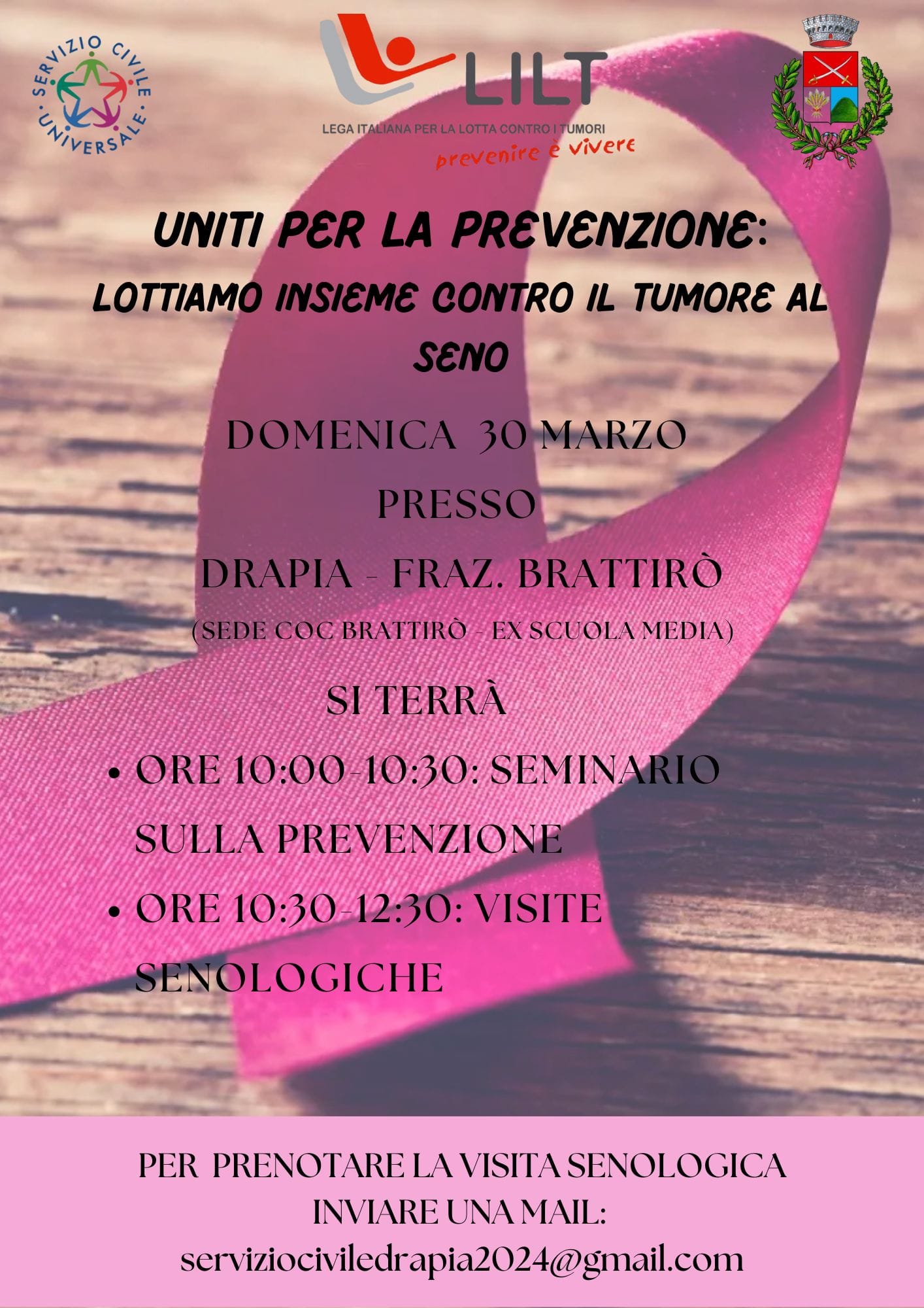 La Lega italiana per la lotta contro i tumori entra in sinergia con i volontari del servizio civile e con l’amministrazione comunale di Drapia, proponendo un importante momento di prevenzione e di sensibilizzazione per tutti i cittadini. In tal senso, domenica 30 marzo, a Brattirò di Drapia e a partire dalle ore 10:00, sarà organizzata un’iniziativa che è interamente dedicata alla cura e alla prevenzione del tumore al seno, presso la sede del Centro operativo comunale (Coc), ex scuola media. Questo appuntamento, inoltre, è stato fortemente voluto dal primo cittadino Alessandro Porcelli e dall’assessore Giovanna Iannello, nonché da tutta la giunta comunale.