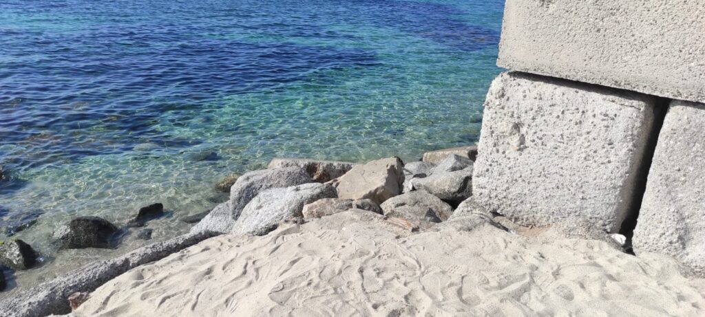 L’acqua arriva sugli scogli che separano il mare dai blocchi di cemento del vicino campeggio, senza che ci sia un minimo spazio sabbioso in cui poter passare anche in fila indiana. Tutto ciò comporta che la spiaggia debba essere raggiunta a nuoto per diversi metri o, in alternativa, che bisogna arrampicarsi tra gli scogli con il probabile rischio di farsi male.
