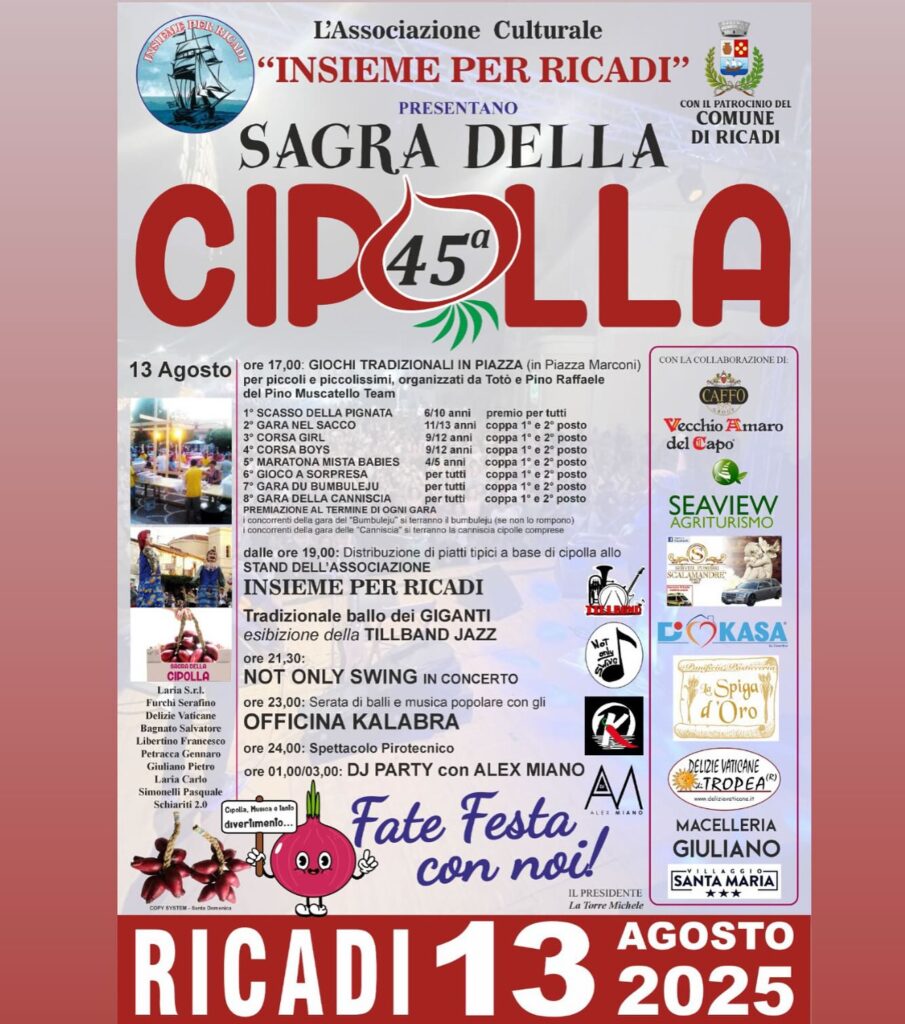 Precedendo di pochi giorni il ferragosto, la Sagra della Cipolla Rossa di Ricadi è ormai alle porte e sarà prevista tradizionalmente il 13 agosto. Un evento, questo, che è da sempre legato alla storia del popolo ricadese e che raggruppa tradizioni, musica e il sapore inconfondibile della cipolla rossa. Era il 1977 quando, su iniziativa di un comitato cittadino, fu presentata la prima edizione, puntando a promuovere un prodotto che è un’eccellenza nell’ambito della gastronomia calabrese.
