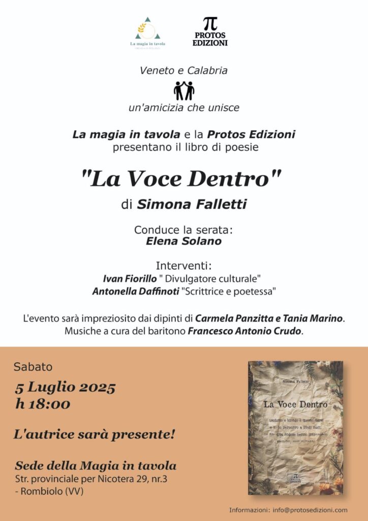 “Veneto e Calabria, un’amicizia che unisce“: sarà questo il titolo dell’iniziativa che si svolgerà presso la sede dell’azienda “La magia in tavola”, situata nel territorio comunale di Rombiolo e precisamente lungo la strada provinciale 29 che va per Nicotera. Organizzato dall’azienda, in collaborazione con la casa editrice Protos Edizioni, l’appuntamento avrà inizio alle ore 18:00 del 5 luglio e sarà dedicato all’opera d’esordio della scrittrice Simona Falletti.