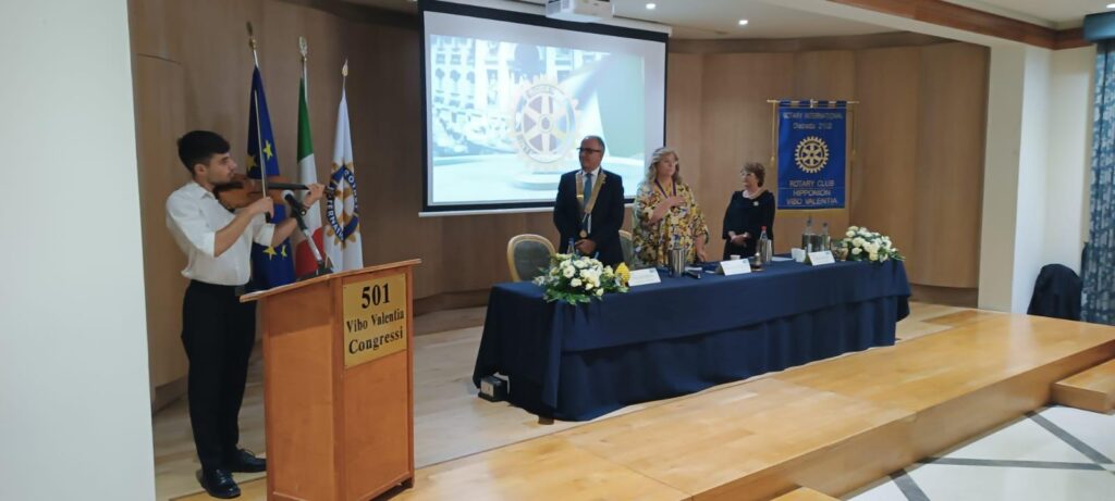 La serata si è aperta con l’esibizione del giovane violinista Samuele Barbuto, allievo del maestro Diego Ventura del Liceo Statale “Vito Capialbi”, che ha eseguito gli inni di rito. L’evento ha visto la partecipazione di autorità rotariane, rappresentanti del distretto e dei club, e numerosi ospiti, presentati con garbo e stile da Cinzia Ieracitano, prefetto del club.