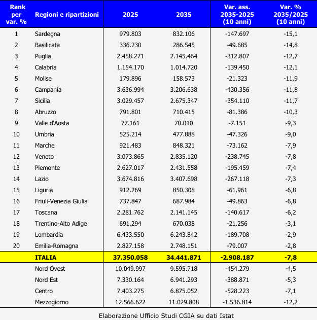 A sentire le proiezioni demografiche, entro i prossimi dieci anni le persone in età lavorativa (fra i 15 e i 64 anni) diminuiranno di 2.908.000 unità, il che equivale al 7,8% (la metà interesserà le regioni meridionali). A inizio 2025, l’Istat ci informava che tale fascia di popolazione ammonta oggi a 37,3 milioni e che gli attuali occupati totali sono 24,3 milioni; platea demografica che scenderà a 34,4 milioni nel 2035. Il progressivo invecchiamento sarebbe alla base del calo, dacché il numero sempre più ridotto di giovani e la prossima uscita di molti baby boomer (nati negli anni Sessanta) dal mercato del lavoro genereranno uno sfoltimento della coorte potenzialmente occupabile. Un trend condiviso, sciaguratamente, da ogni singola provincia italiana: la variazione assoluta negativa non dovrebbe lasciare scampo, al di là dei territori.