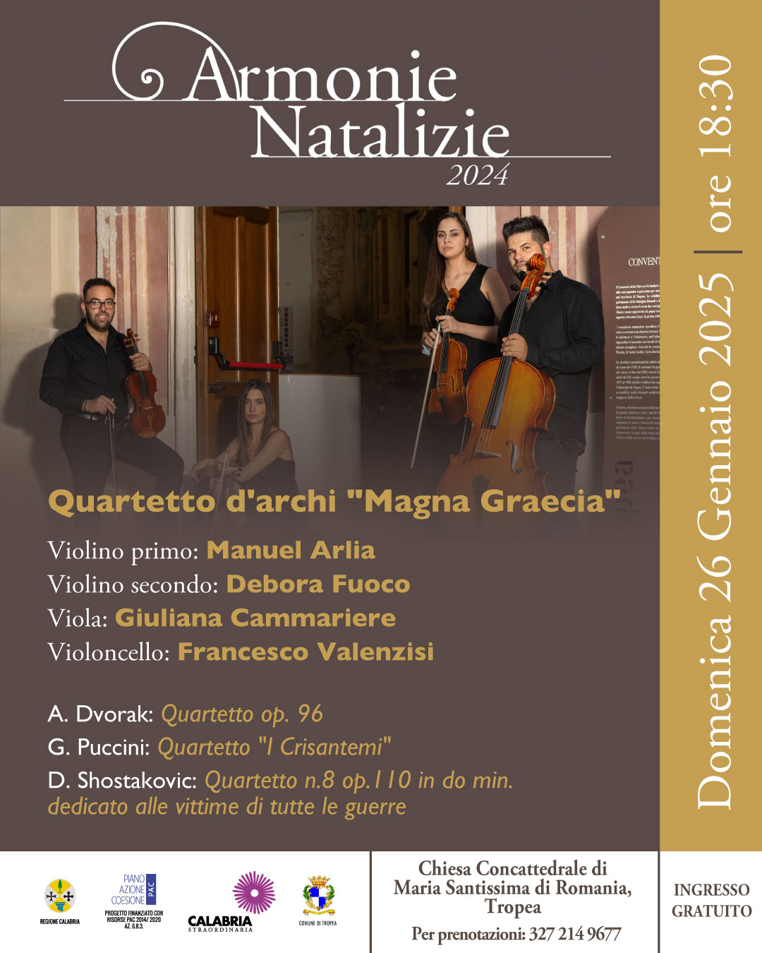 Protagonista della serata è il rinomato Quartetto d’archi Magna Graecia, composto da Manuel Arlia (violino primo), Debora Fuoco (violino secondo), Giuliana Cammariere (viola), Francesco Valenzisi (violoncello).