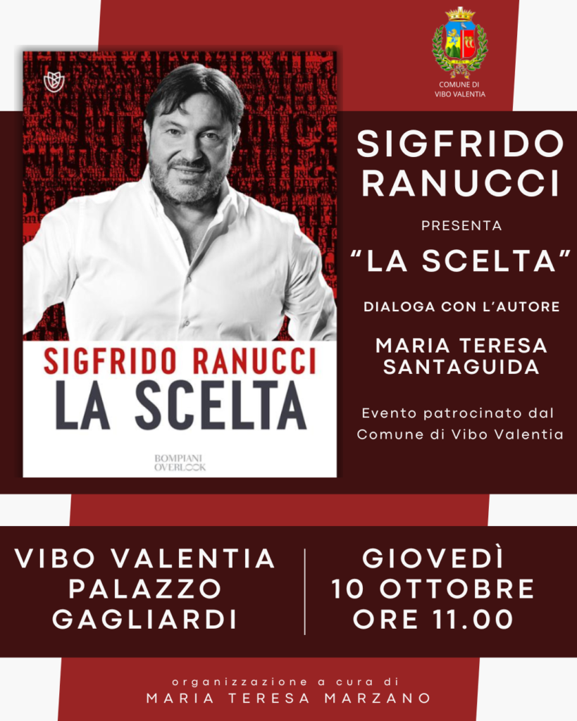 «L’amministrazione comunale di Vibo Valentia è lieta di comunicare la presentazione del libro del giornalista e conduttore di Report, Sigfrido Ranucci, che sarà in città per parlare del suo ultimo volume, La Scelta». È quanto afferma l’assessore alla Cultura, Stefano Soriano, nell’annunciare l’appuntamento con il noto giornalista Rai in programma per giovedì 10 ottobre, alle ore 11.00, nell’atrio di Palazzo Gagliardi a Vibo Valentia. A porgere un saluto, oltre all’assessore Soriano, sarà presente il procuratore capo della Repubblica di Vibo Valentia, Camillo Falvo.