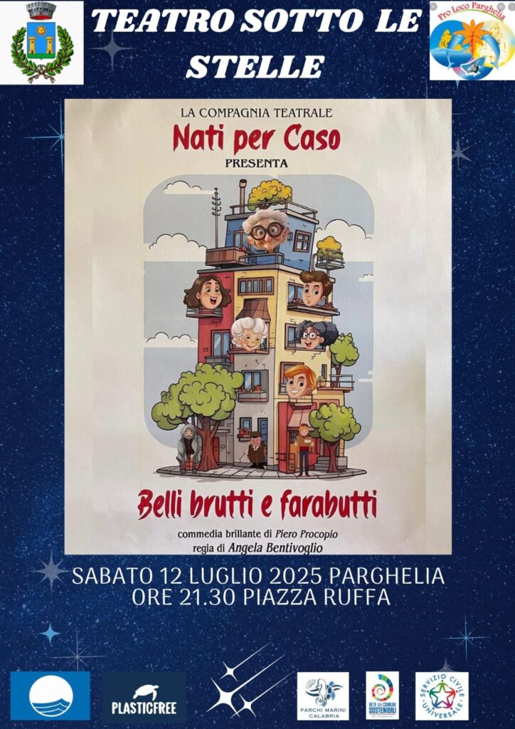 La comunità di Parghelia si prepara ad accogliere, presso Piazza Ruffa, la compagnia teatrale “Nati per caso”. Infatti, nell’ambito dell’iniziativa “Teatro sotto le Stelle”, questa sera, 12 luglio, sarà proposta la commedia “Belli, brutti e farabutti”, scritta da Piero Procopio e diretta alla regia da Angela Bentivoglio.