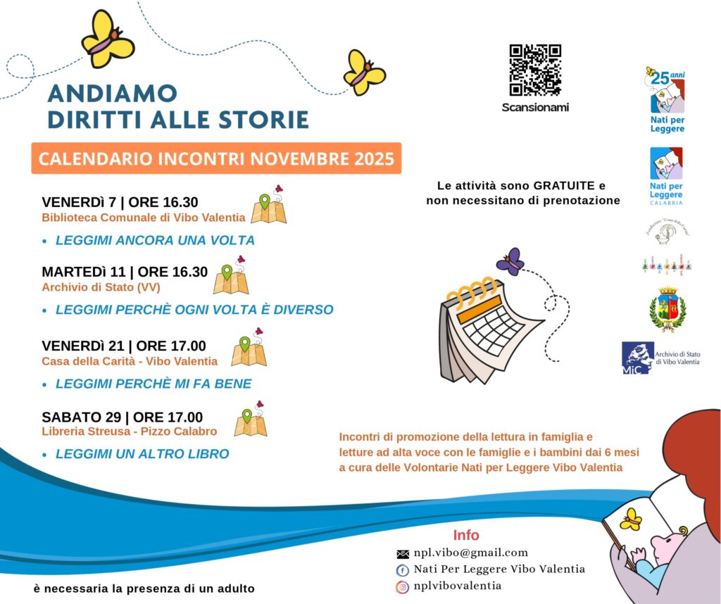 Novembre profuma di libri, parole condivise e voci che si intrecciano grazie a “Nati per Leggere – Vibo Valentia”, il progetto locale di promozione della lettura in famiglia, che annuncia una nuova stagione di appuntamenti per bambini e genitori.