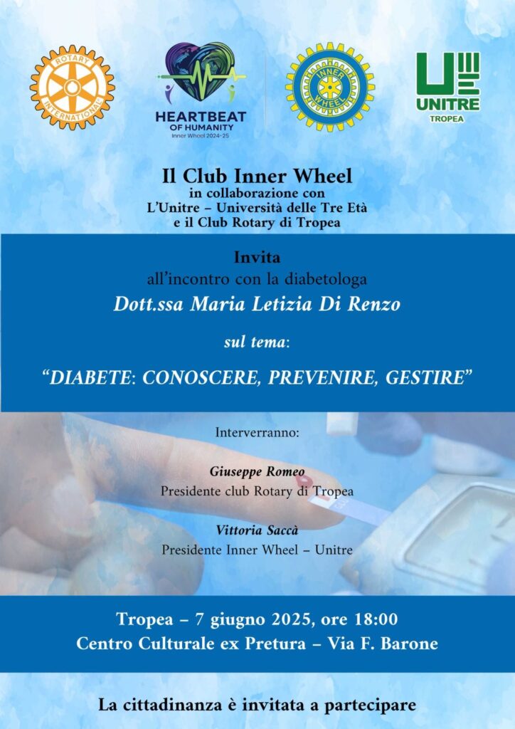 Il convegno è intitolato “Diabete, conoscere, prevenire, gestire” e si svolgerà a partire dalle ore 18:00, su iniziativa del Club Inner Wheel di Tropea. Inoltre, l’iniziativa sarà sostenuta dall’Unitre – Università delle Tre Età di Tropea e dal Club Rotary di Tropea.