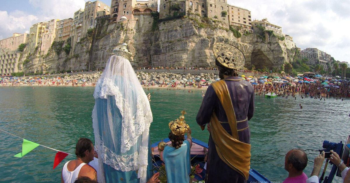 La giornata si aprirà con le funzioni liturgiche nelle chiese della città, momento di preghiera e raccoglimento per fedeli e visitatori. Poi, seguendo la tradizione, le statue saranno portate in processione fino al porto, dove imbarcazioni addobbate a festa le accoglieranno per il suggestivo itinerario via mare. Il corteo scivolerà lentamente tra le acque cristalline che lambiscono la Rupe di Tropea, offrendo una scenografia unica: il bianco del santuario che svetta sullo scoglio, il blu intenso del Tirreno e il sottofondo di preghiere e canti mariani. Un momento capace di unire spiritualità e paesaggio in un’unica emozione.