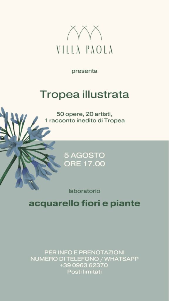 Una riduzione della mostra “Tropea illustrata” sarà anche esposta, dal 2 agosto al 30 settembre, nel prestigioso Hotel Villa Paola, a Tropea che in collaborazione con gli artisti organizza laboratori creativi attraverso i quali avvicinarsi al meraviglioso mondo dell’arte.