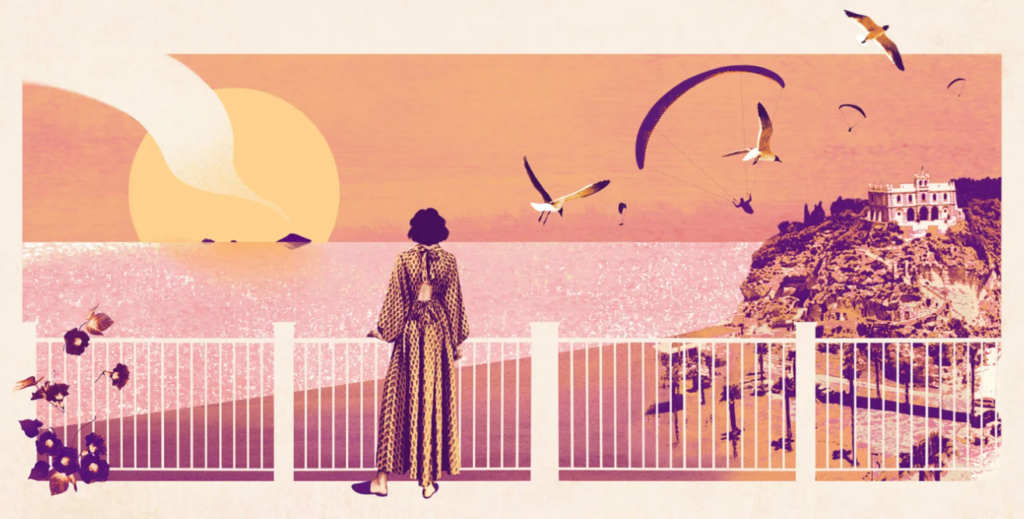 «Sospesa tra cielo e mare, affacciata sulla terrazza del belvedere di Piazza Cannone – riferisce l’artista -, una donna osserva verso l’infinito ma anche dentro di sé, in equilibrio tra il passato e il presente, tra ciò che è stato e ciò che può ancora diventare. È arrivata a Tropea per caso, o forse per destino, ed è il momento del tramonto, quando il cielo si tinge di rosa e oro, e i gabbiani gridano storie portate dal vento giocando con i parapendii che danzano nell’aria come pensieri liberi. Ogni passo tra le viuzze antiche, ogni respiro salato tra le pareti rocciose che portano al mare, la riconnette a qualcosa di più profondo. Il sole la accarezza e le dona sensazioni dimenticate, i profumi mediterranei la risvegliano, e le onde che si infrangono contro le rocce sembrano scandire un nuovo ritmo nel suo cuore. In quel momento, Tropea non è solo un luogo, è una cura. È lì che ricomincia a sognare. È lì che si ritrova».