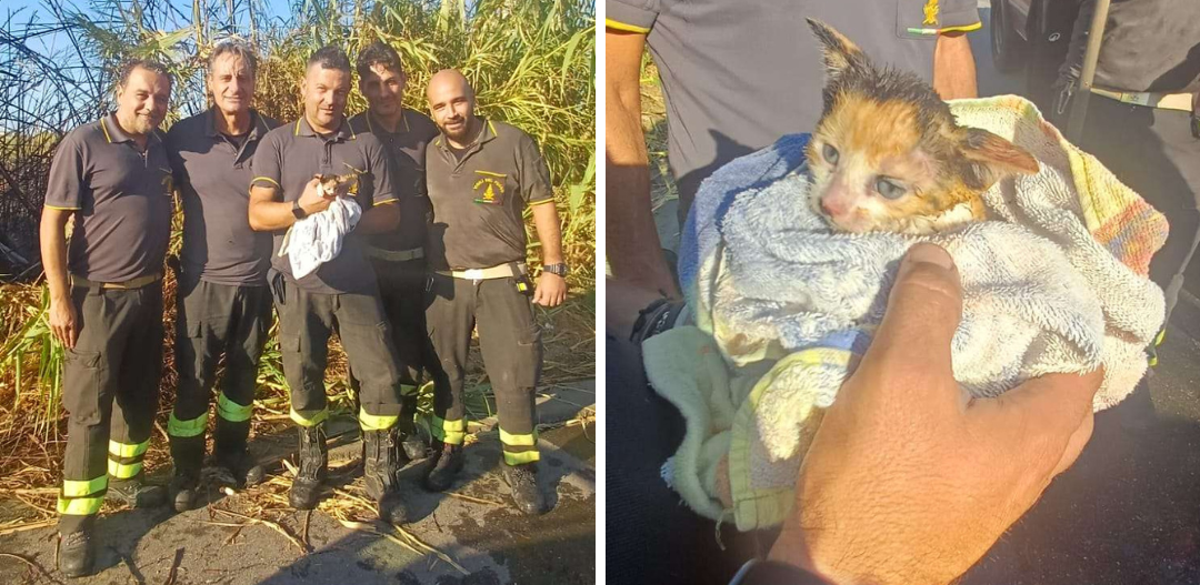 Durante le operazioni di spegnimento i soccorritori hanno sentito il miagolio di un gattino provenire dal canneto interessato dall’incendio, e pertanto hanno rivolto l’azione verso il punto in cui si poteva trovare il felino, riuscendo così a salvarlo.