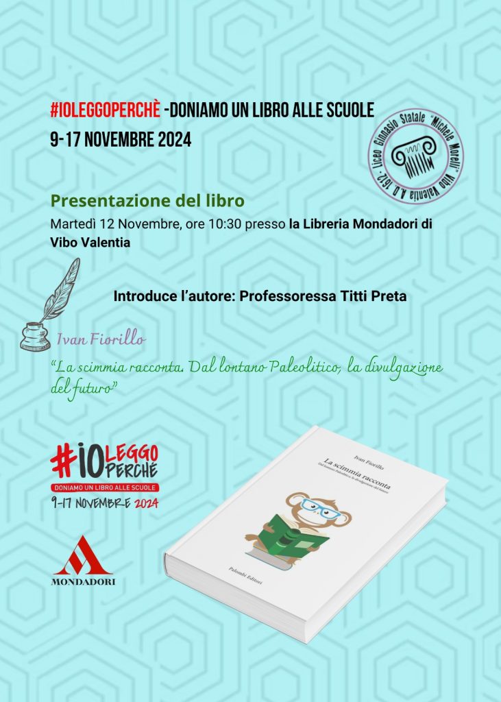 Per il contest nazionale ‘#ioleggoperché’, organizzato dall’Associazione Italiana Editori, alla Mondadori Bookstore di Vibo Valentia accoglierà martedì 12 novembre 2024 alle 10:30 un evento laboratoriale, aperto al pubblico, basato sul nuovo saggio di Ivan Fiorillo e con la partecipazione della classe 4^ E quadriennale del Liceo Classico “Michele Morelli”, accompagnata dalla professoressa di Lettere Maria Concetta Preta. Il tema dell’anno, “Il futuro inizia con un libro”, sarà declinato nella prospettiva indicata da “La scimmia racconta. Dal lontano Paleolitico, la divulgazione del futuro”, in cui l’autore – ricercatore, docente e divulgatore – traccia indicazioni utili per chiunque si proponga di divulgare contenuti in qualsiasi contesto, grazie all’inedita formulazione di modelli comunicativi esposti ed esemplificati nel testo.