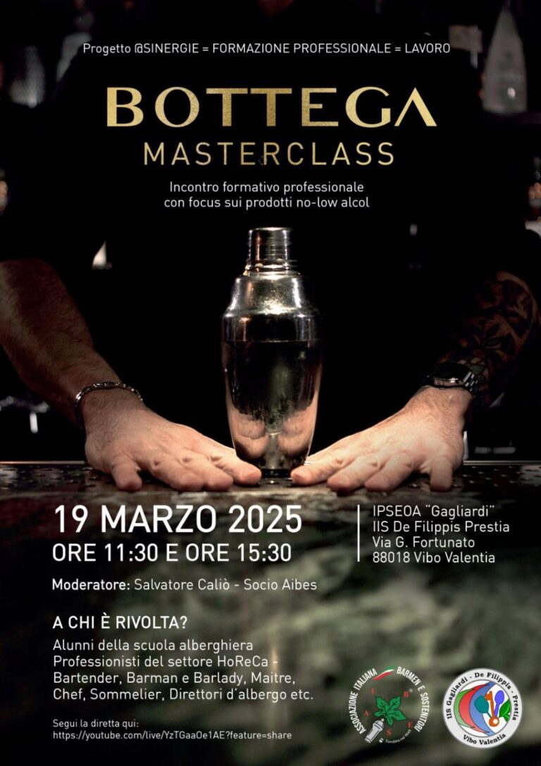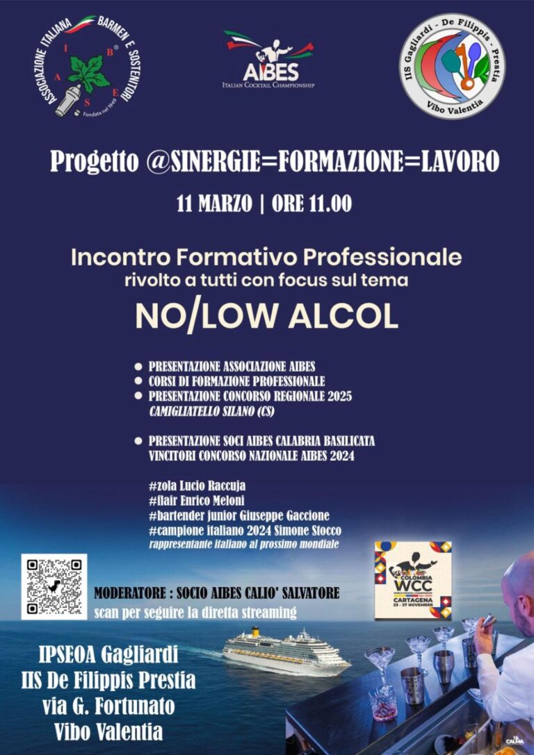 L’11 marzo, invece, aprono le danze, sempre all’Alberghiero di Vibo Valentia, l’associazione Aibes Calabria Basilicata con un incontro, anche in streaming, sul progetto @Sinergie = Formazione professionale = Lavoro. Dopo la presentazione dell’associazione, dei propri corsi e del progetto di sinergia con la nostra scuola, saranno presentati nuovi corsi di formazione professionale con la testimonianza dei soci Aibes calabresi ed in particolare dei vincitori del concorso Nazionale 2024. Verranno presentati i momenti salienti di Loano, sede del concorso nazionale, con l’esibizione dei vincitori nelle specialità Zola, Flair e Bartender Junior, primo posto assoluto che rappresenterà l’Italia al mondiale a Cartagena.