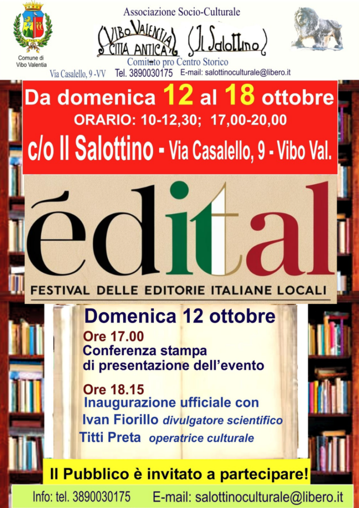 Il festival è stato ideato dal divulgatore culturale Ivan Fiorillo e si svolgerà dal 12 al 18 ottobre presso la sede dell’Associazione culturale “Il Salottino” in via Casalello 9 a Vibo Valentia, con orari di apertura dalle ore 10:00 alle ore 12:30 e dalle ore 17:00 alle ore 20:00.