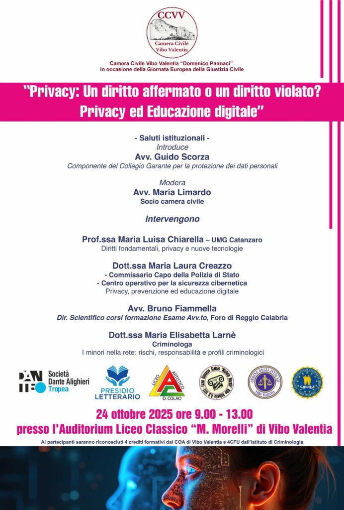 Il 24 ottobre 2025 nell’Auditorium del Liceo Classico di Vibo Valentia, in occasione della Giornata Europea della Giustizia Civile, la Camera Civile di Vibo Valentia ha organizzato l’evento: “Privacy: Un diritto affermato o un diritto violato? Privacy ed Educazione digitale“.