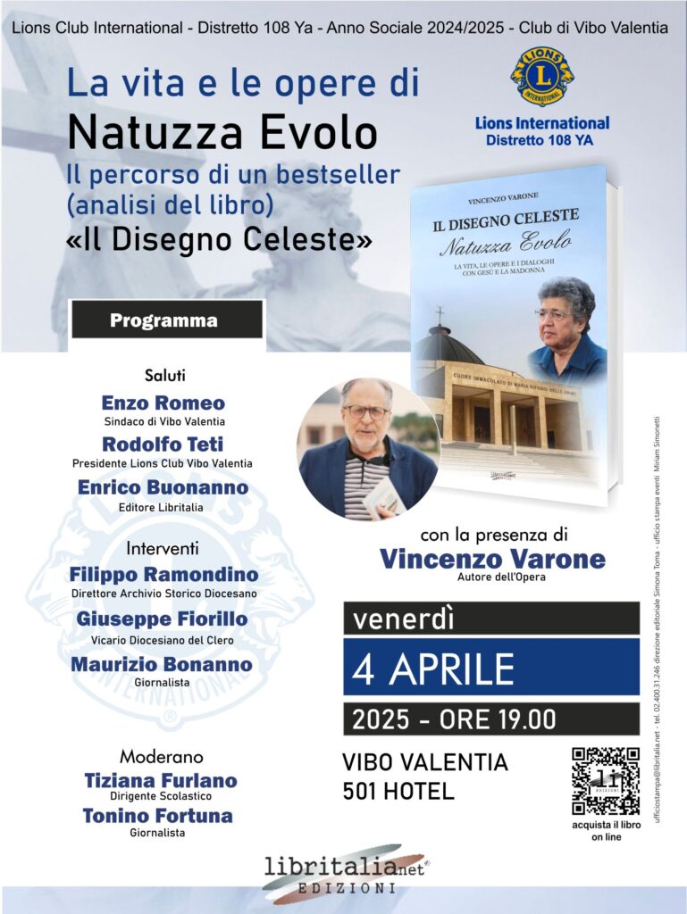 Organizzato dal Lions Club Città di Vibo Valentia e dalla casa editrice “Libritalia”, si svolgerà, venerdi 4 aprile, alle ore 19, al 501 Hotel, un incontro in cui si parlerà del percorso del volume “Il Disegno Celeste” di Natuzza Evolo, da tempo tra i libri più richiesti e che a più riprese è entrato a far parte della classifica dei bestseller di Amazon nella categoria “Spiritualità Cristiana”, collocandosi agli inizi del mese di agosto 2024 costantemente dall’uno al trentesimo posto.