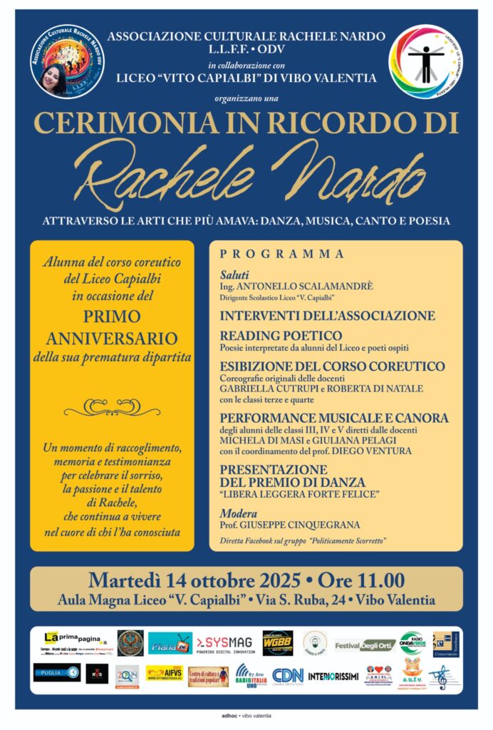 Nel primo anniversario della scomparsa di Rachele Nardo, l’Associazione Culturale “Rachele Nardo Llff – Odv Libera, Leggera, Forte, Felice” e il Liceo “Capialbi” di Vibo Valentia promuovono una cerimonia commemorativa per ricordare Rachele attraverso le arti che più amava: danza, musica, canto e poesia. L’iniziativa, che si terrà martedì 14 ottobre alle ore 11.00 presso l’Aula Magna del Liceo Capialbi, intende trasformare il dolore in memoria viva.