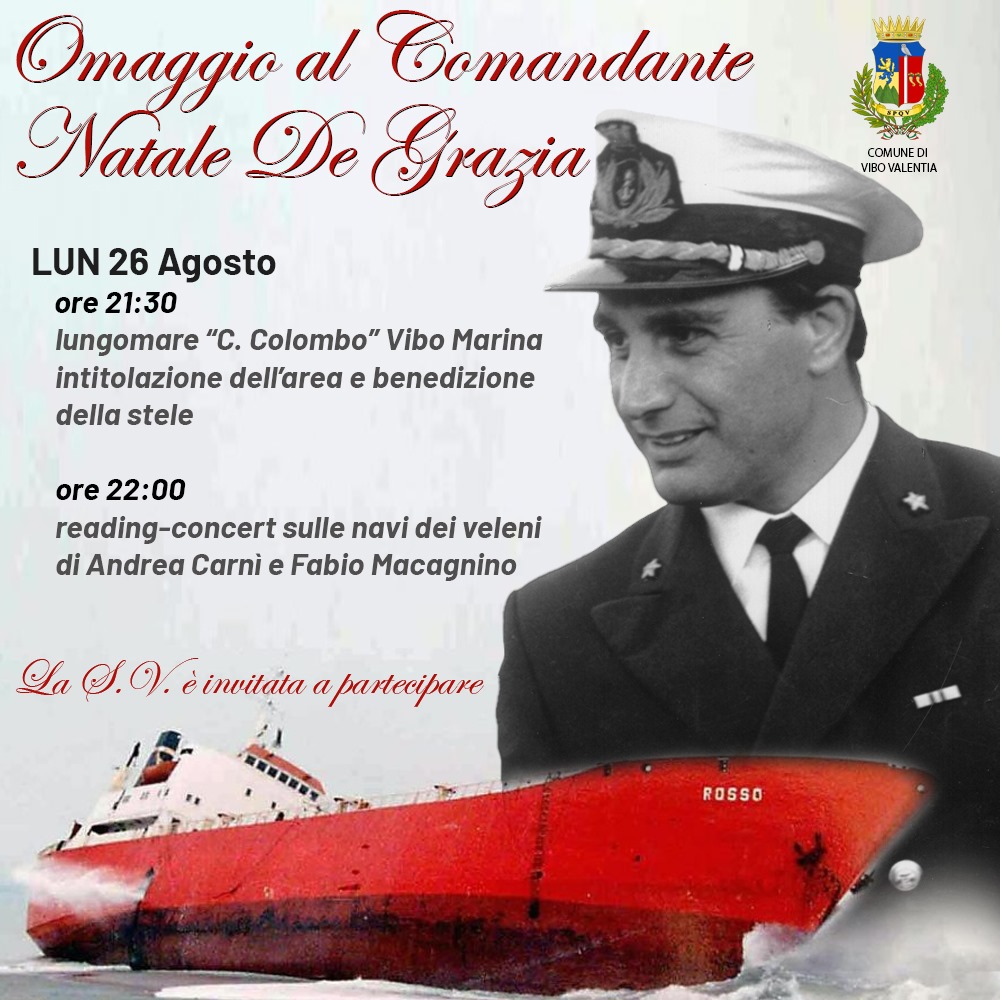 L’iniziativa è curata dal consigliere delegato al Porto, Silvio Pisani, il quale spiega: «Abbiamo ritenuto doveroso tributare un giusto riconoscimento ad un uomo che è vissuto alla ricerca della verità, e che è morto proprio per quella verità nascosta in fondo al mare. Ringrazio il sindaco che ha accolto da subito la proposta, che non è soltanto quella di una serata di intrattenimento, ma anche un momento formale nel corso del quale verrà intitolata una vasta area adiacente il lungomare, proprio al Comandante De Grazia, il “Belvedere De Grazia”, appunto. Scopriremo una stele che riceverà la benedizione sacerdotale, e che ci sembrava un doveroso omaggio ad un ufficiale che a Vibo Marina ha prestato servizio per diversi anni. A seguire, il reading-concert sulle navi dei veleni. Quelle navi sulle quali anche Natale De Grazia indagò a lungo, e che probabilmente gli costarono la vita».