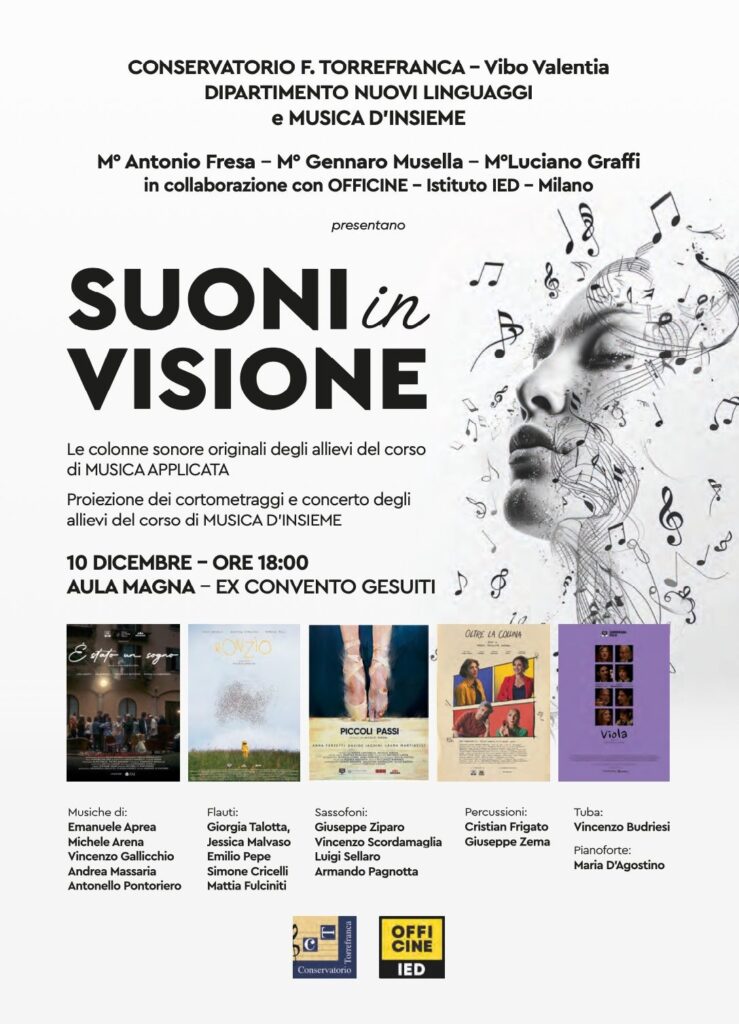 Mercoledì 10 dicembre, alle 18:00, l’Aula Magna del Conservatorio “Fausto Torrefranca” di Vibo Valentia, all’interno dell’ex Collegio dei Gesuiti, si trasformerà in un palcoscenico sospeso tra immagini e note grazie all’evento Suoni in Visione che invita il pubblico a un viaggio multisensoriale, dove cortometraggi e musica dal vivo si incontrano in un dialogo creativo e sorprendente.