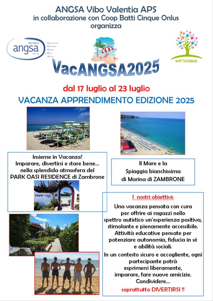 A partire da oggi e fino al 23 luglio, l’Angsa di Vibo porterà avanti un progetto d’inclusione sociale per i ragazzi che sono affetti da autismo. La struttura che ospiterà tutti loro, invece, è il Park Oasi Residence, situato a poca distanza dalla spiaggia della Marina di Zambrone. Si tratterà non soltanto di un progetto con attività di svago, ma anche di un percorso dal forte valore formativo. Per una settimana esatta, infatti, ogni ragazzo potrà rilassarsi tra sole e mare, acquisendo tantissimi stimoli per sviluppare nuove abilità e per condividere tanti sorrisi. L’iniziativa è stata simbolicamente chiamata “VacAngsa 2025” e sarà sostenuta dalla Coop “Batti Cinque” onlus.